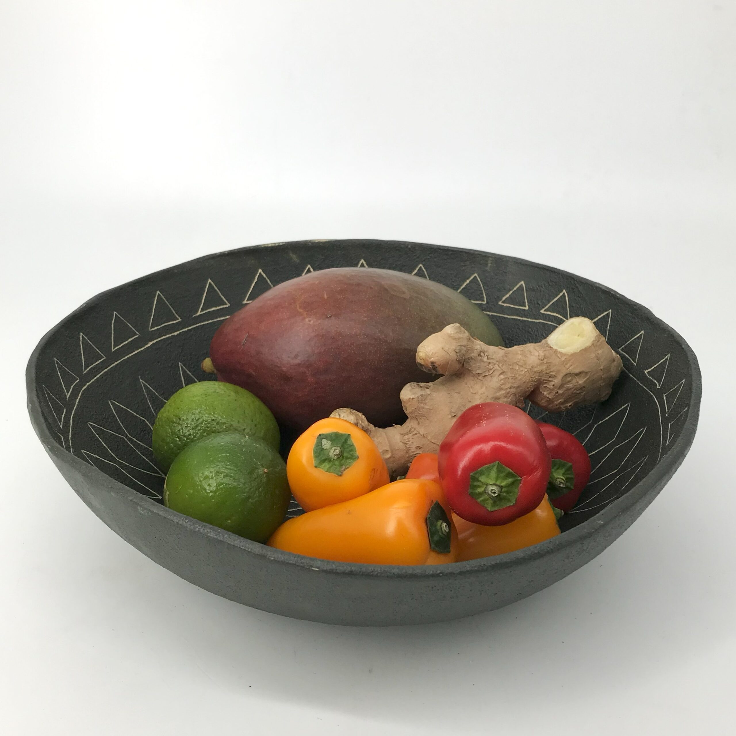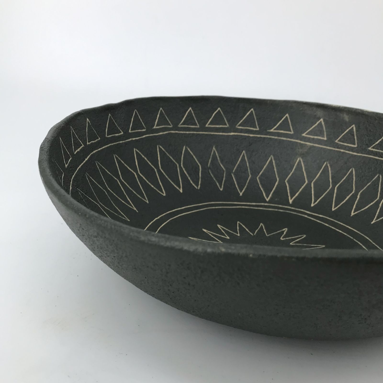 Kolor głęboko czarny z delikatnym, surowym połyskiem. Na wewnętrznej stronie miski rozchodzi się rytmiczny, promienisty wzór wyryty w glinie, przypominający słońce lub rozetę. Brzegi nieregularne, organiczne.