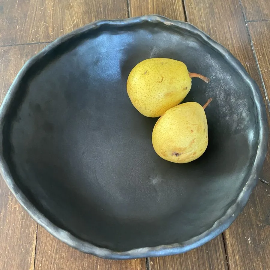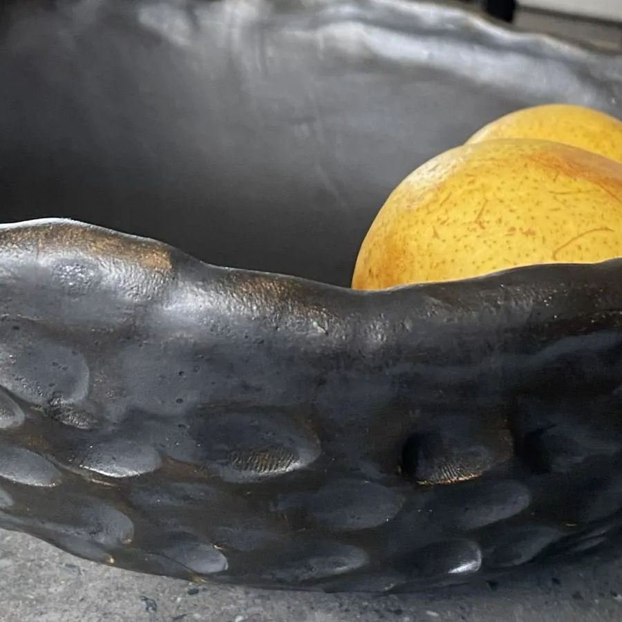 Kolor głęboki czarny z lekko metalicznym połyskiem. Powierzchnia nieregularna, z subtelnymi wgłębieniami, podkreślającymi ręczny charakter naczynia. Forma szeroka i niska – średnica ok. 30 cm, wysokość 10 cm.