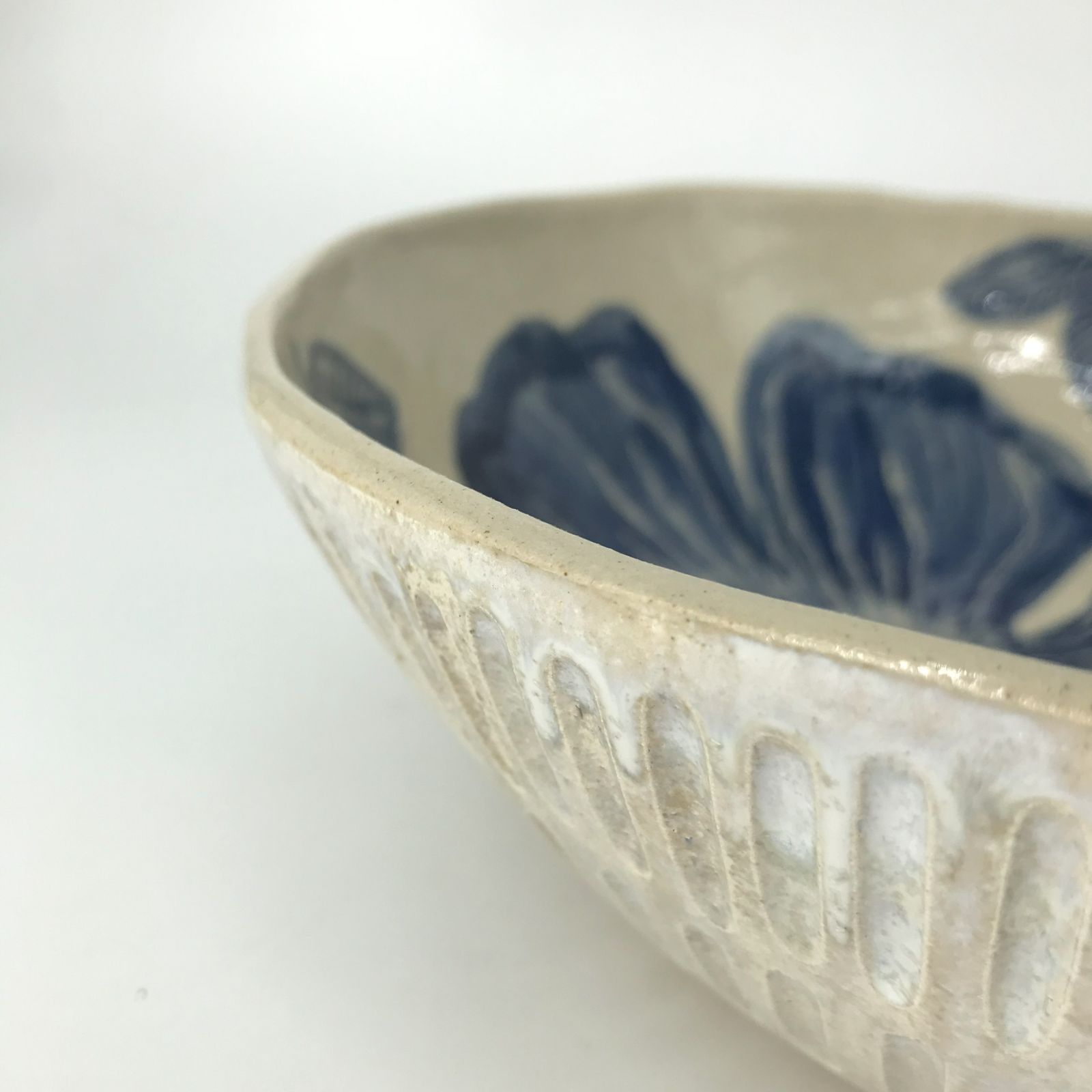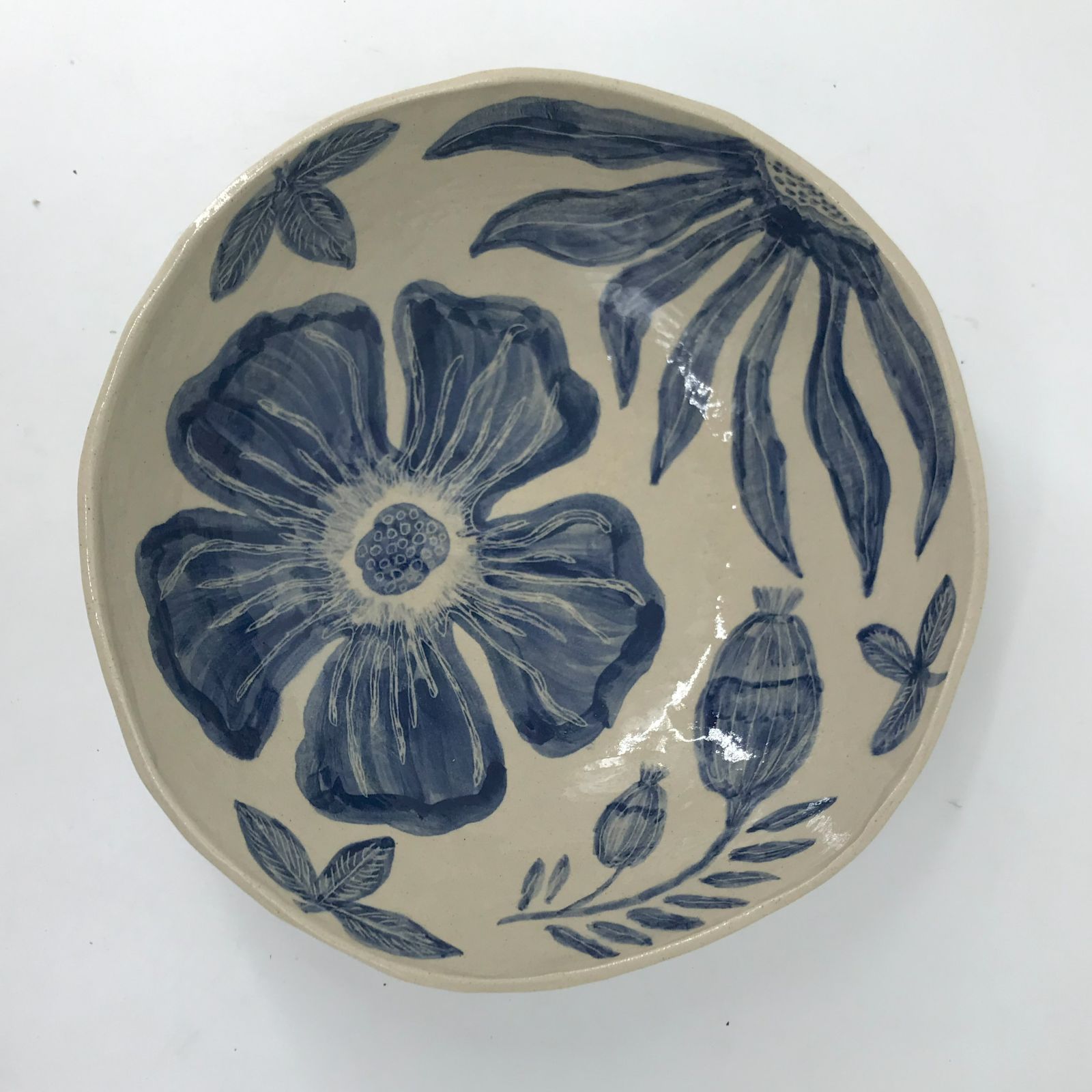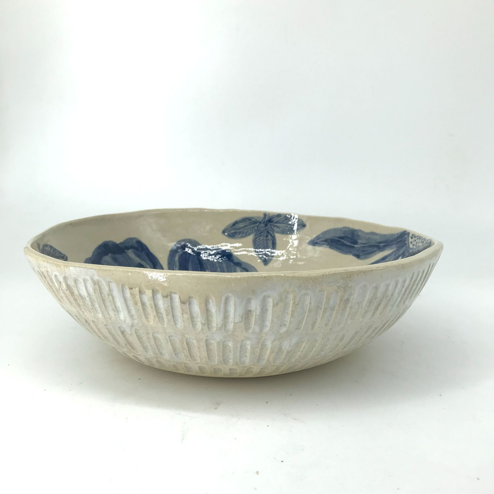 Duża misa ceramiczna z kolekcji Cobalt Nature. Ręcznie formowana i malowana kobaltową angobą z motywem kwiatów. Naczynie użytkowe o walorach dekoracyjnych – idealne do serwowania potraw lub jako centralna ozdoba stołu. Ceramika Merence.