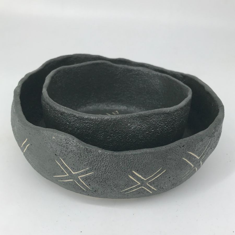 Kamionka wysokopalona (ok. 1220°C). Przeznaczone do kontaktu z żywnością; z zewnątrz czarna angoba z rytym wzorem sgraffito (wzór X). Praca ręczna – możliwe subtelne różnice.