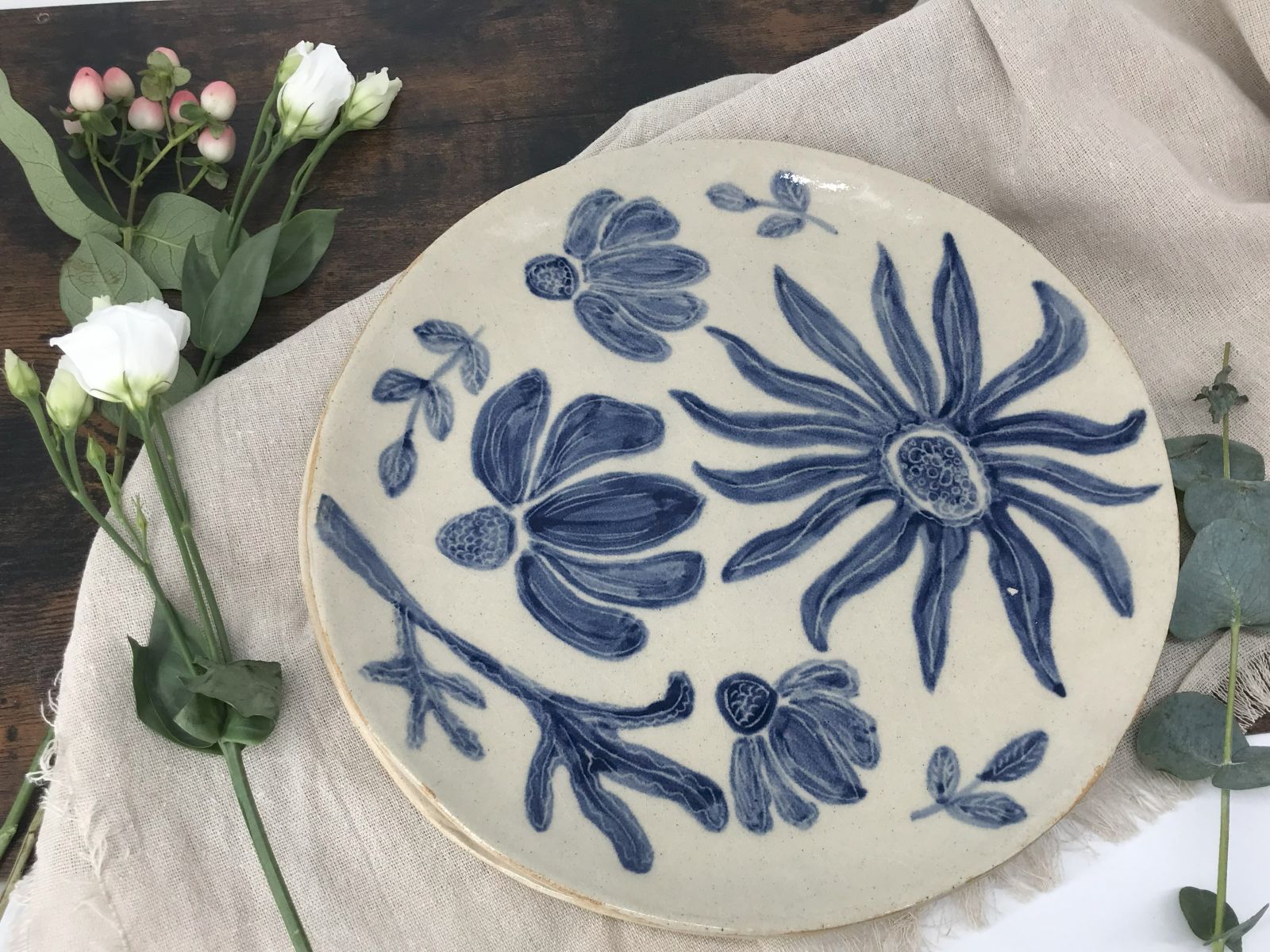 Patera ceramiczna z motywem kwiatów, ręcznie zdobiona kobaltową angobą. Idealna jako dekoracja stołu lub talerz do serwowania. Rękodzieło Merence Ceramika.