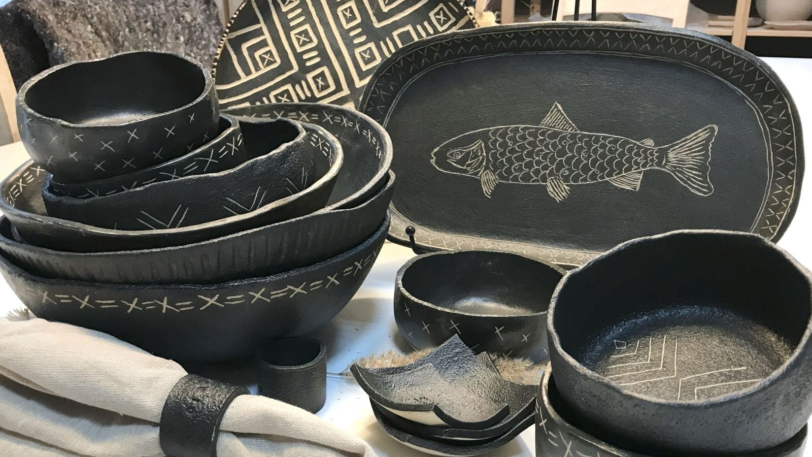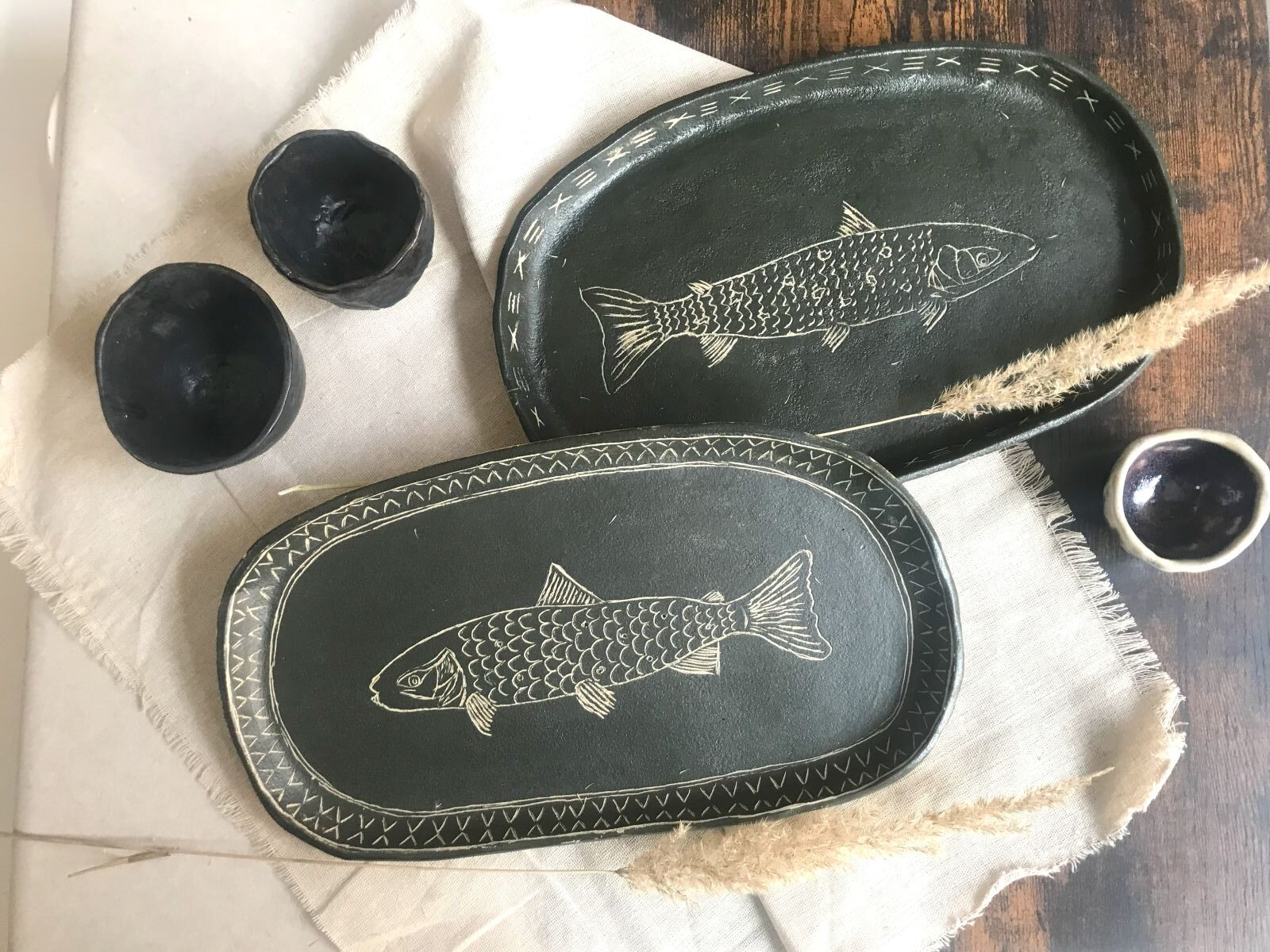 Patera Noir Terra – Ryba 01 to unikatowy półmisek wykonany ręcznie z wysokopalonej kamionki, pokrytej czarną angobą i zdobionej techniką sgraffito. Motyw ryby, wyryty ręcznie, przywołuje skojarzenia z etnicznymi ornamentami i sztuką ludową, a surowe, matowe wykończenie dodaje naczyniu wyrazistości i charakteru.