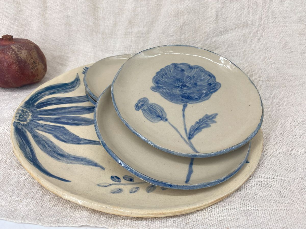 Zestaw czterech ręcznie formowanych talerzyków z kobaltowym motywem maków. Idealne do deserów, ciast lub serwowania przekąsek.